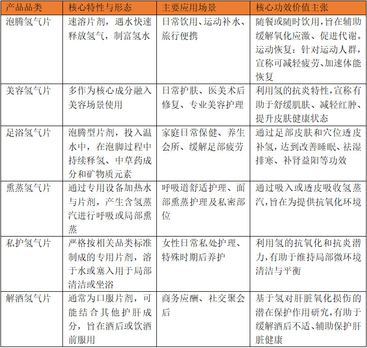 表2 主要氢气片品类特性、应用场景与功效价值分析